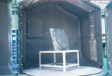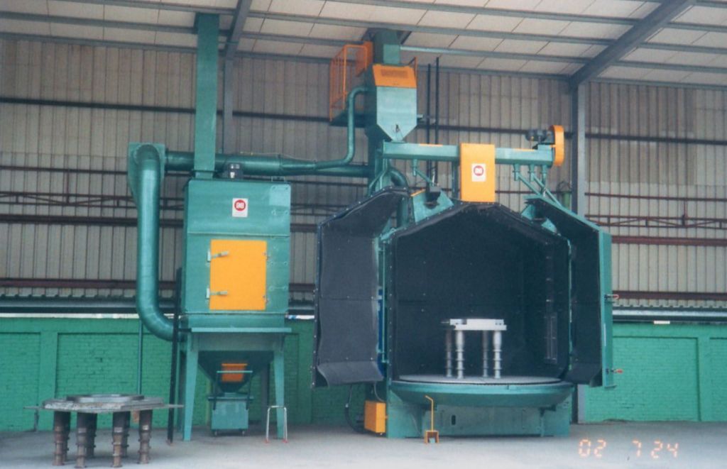 迴轉轉盤式離心輪甩噴砂機整套包含一台集塵機、砂體分離器、砂體回收輸送系統、儲砂槽、鏟斗輸送機及感應控制系統等,設計用於在鋼鐵構件產品上除漆除鏽,整台機器上面裝配有3台或4台或更多台離心式甩輪,以便在工件上面達到最佳之噴砂清潔面與粗糙面,噴砂艙內部體積大小及迴轉式轉盤之承載重量依被噴工件之體積及重量而設計。